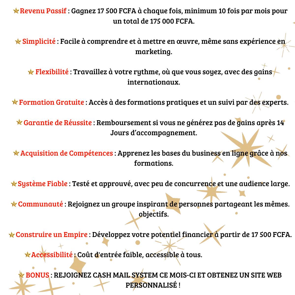 Le CASH MAIL SYSTEM m'a ouvert les yeux sur les opportunités en ligne. Je ne pensais pas que je pouvais générer des revenus aussi rapidement !