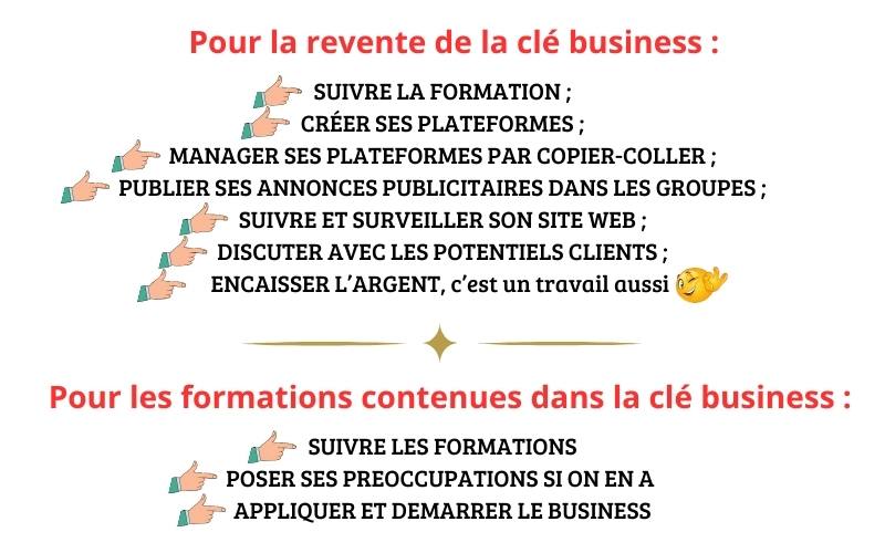 Nous l’avons dit précédemment, nous avons deux volets : La Revente de la CLÉ BUSINESS et l’Utilisation des formations en web entrepreneuriat contenues dans la clé, pour multiplier ses sources de revenus.